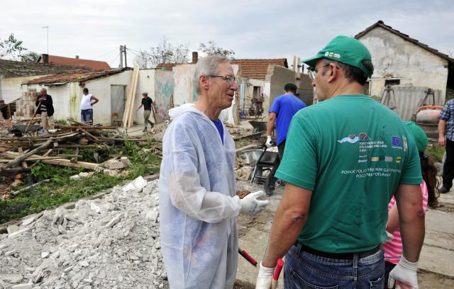 OBRENOVAC - Ambasadori EU i SAD, Majkl Devenport i Majkl Kirbi, kao i brojni volonteri iz raznih kompanija učestvovali su danas u sanacija kuća i objekata pogođenih poplavama u Obrenovcu.Ambasadori i volonteri su pomogli u uklanjanju maltera i saniranju unutrašnjih prostorija u domovima devet porodica, kao i u uređenju bioskopa "Palež" i dvorišta vrtića "Neven".