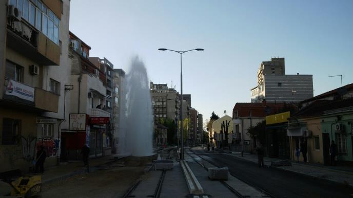 Tamo gde se mnogo radi povećana je i mogućnost greške, pa je tako nehotično neko od radnika zakačio vodovodnu cev, stvarajući nedaleko od voždovačke crkve, jedan pravi mali gejzir.