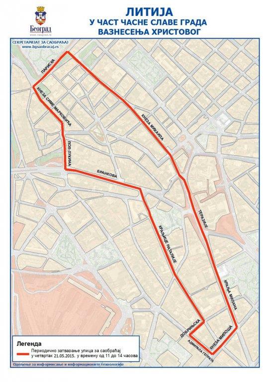 Trasa litije je: Admirala Geprata (početak litije ispred Crkve Svetog Vaznesenja) – Kneza Miloša (od Admirala Geprata do Kralja Milana) – Kralja Milana – Terazije (zaustavljanje pet do deset minuta ispred hotela „Moskva”) – Kneza Mihaila – Pariska (zaustavljanje ispred Saborne crkve) – Kneza Sime Markovića – Pop Lukina – Brankova – Kraljice Natalije (od Zelenog venca do Dobrinjske) – Dobrinjska. Toga dana, od 10 do 15 časova biće uklonjeni svi privremeni montažni objekti (pokretni prodajni objekati i bašte otvorenog tipa) koji ometaju trasu litije.