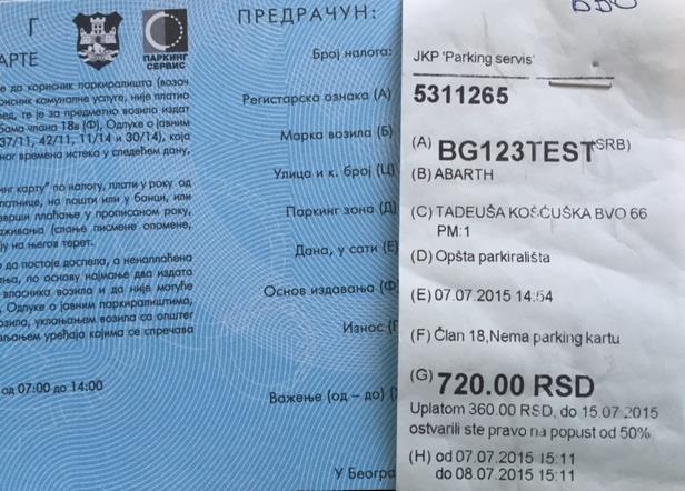 Nova cena dnevne parking karte u plavoj zoni od danas je 720 dinara, što praktično znači da oni koji dobiju nalog za plaćanje dnevne karte imaju mogućnost da ga regulišu u periodu od osam dana po upola nižoj ceni tj. za 360 dinara. Oni koji prekorače rok za plaćanje od osam dana od datuma izdavanja plaćaju pun iznos.