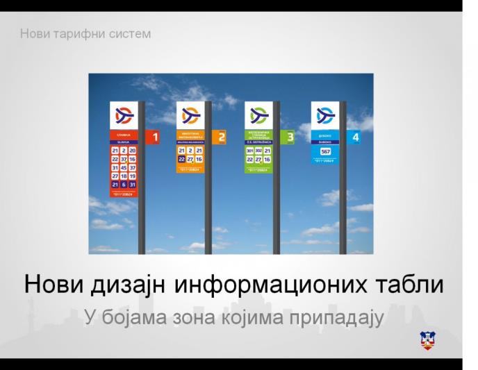 - Suština novog tarifnog sistema je da će sada Beograd biti podeljen u četiri zone koje će pratiti boje zona iz „Parking servisa”. Granica prve zone je najuži centar grada, a obuhvata Kvantaš, Blok 45, Blagoja Parovića, Pere Velimirovića, Mirijevski bulevar, ugao Bulevara kralja Aleksandra i Ustaničke i kanal Sebeš. Druga zona obuhvata Opovo, Ugrinovce, Boljevce, Lipovičku šumu, Ripanj i Grocku. Treća zona su Barajevo, deo Grocke, Obrenovac i Sopot, a četvrta Lazarevac i Mladenovac. Svaka zona će biti posebno obeležena, a ljudi će to znati po boji stajališta i validatora - rekao je Vesić.