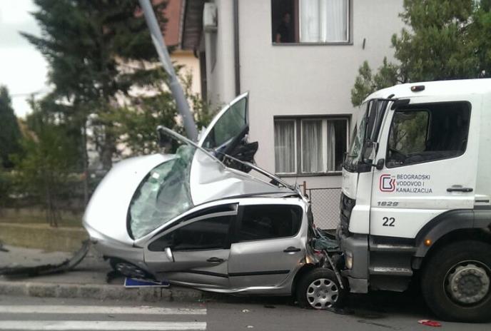 BEOGRAD - Kod TC Stadion u Beogradu desila se saobraćajna nesreća u 14.45 sati kada se kamion velikom brzinom spuštao nizbrdo i udario u parkirani automobil koji je potom udario u banderu.