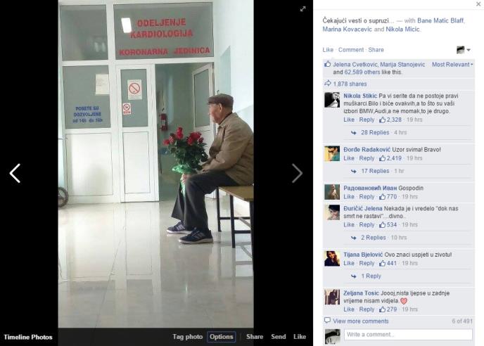 Jedna stranica na Fejsbuku postavila je fotografiju starijeg gospodina u bolnici kako sedi u čekaonici. Na vratima piše "odeljenje kardiologija - koronarna jedinica", pa se zaključuje da mu je neko, najverovatnije supruga tu bila na operaciji.