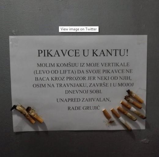 Naslov obaveštenja glasi: “Pikavce u kantu“, i prošle nedelje na obaveštenju su bile zalepljene dve cigarete, a sada ih je mnogo više.