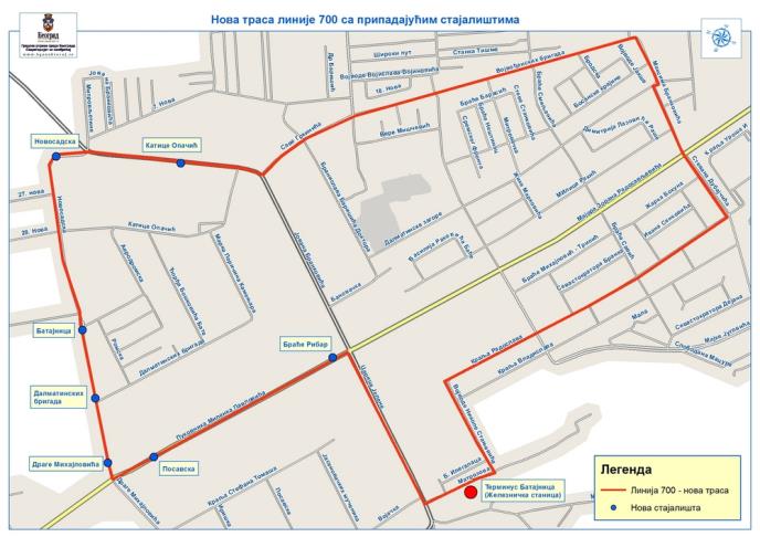 BEOGRAD- Trasa linije 700 biće delimično izmenjena od 14. maja. Vozila na ovoj liniji saobraćaće trasom Batajnica /železnička stanica/ – Matrozova – Carice Jelene – Pukovnika Milenka Pavlovića – Novosadska – Jovana Brankovića – Save Grkinića – Vojvođanskih brigada – Maksima Brankovića – Stevana Dubajića – Kralja Radoslava – Vojvode Nikole Stanjevića – Matrozova – Batajnica /železnička stanica/. Terminus koji će linija koristiti je „Batajnica /železnička stanica/”.