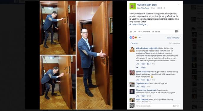 Novi predsednik opštine Stari grad nastavlja staru praksu neposredne komunikacije sa građanima, te je uselivši se u kancelariju predsednika opštine i na njoj uklonio vrata. #cuvamoStarigrad
