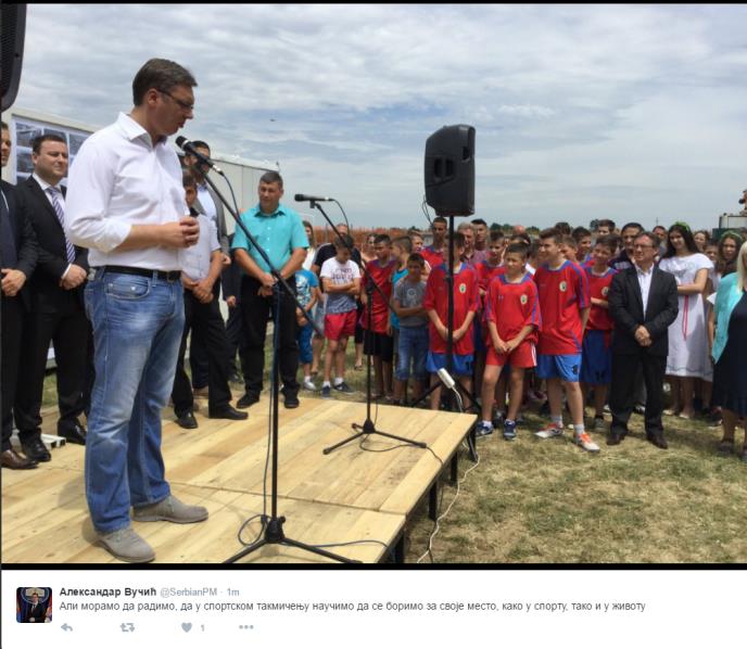 Vučića su dočekali učenici škole sa roditeljima i građani Grabovca, kao i dečaci fudbaleri lokalnog kluba Polet.