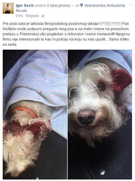 - Pre pola sata je taksista za volanom "fijat multiple" potpuno je pregazio mog psa, a za malo i mene na pečačkom prelazu u Prizrenskoj ulici. Pogledao je u retrovizor i samo nastavio! Njegovu firmu nije interesovalo to, kao ni policiju na koju su nas uputili... Samo toliko za sada - napisao je vlasnik profila Igoor Savić.