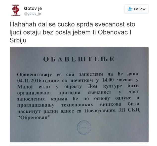 BEOGRAD - Obaveštavaju se svi zaposleni da će dana 4.11. 2016. s početkom u 14 časova u Maloj sali u objektu Doma kulture biti organizovana prigodna svečanost u čast zaposlenih kojima će po osnovu odluke o proglašavanju tehnoloških viškova biti raskinut radni odnos sa poslodavcem JP SKC "Obrenovac", glasi objava koja je danas zapalila srpski Tviter.