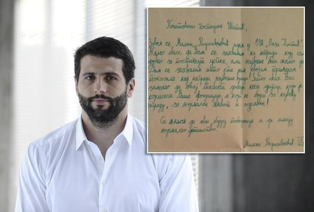 "Poštovani gospodine Šapiću, zovem se Miloš Radisavljević, idem u OŠ "Laza Kostić". Želeo bih da Vam se zahvalim na nagradu koju sam dobio za postignut uspeh, ali najviše bih želeo da Vam se zahvalim što ste nam svojim primerom pokazali kad nagrada vredi! Zato bih Vas zamolio da ovaj tablet dobije neki drugar koji je korisnik Vaše fondacije, a koji se bori za najveću nagradu, za normalan život i zdravlje. Sa željom da svi budu pobednici i da imaju normalno detinjstvo. Miloš Radisavljević VI 3", stoji u pismu ovog osnovca, koje je Šapić podelio sa pratiocima na svom Tviter nalogu.