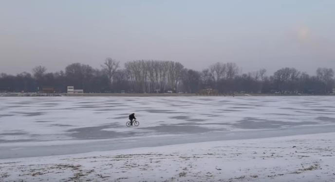 Na internetu je u nedelju osvanuo snimak koji prikazuje nepoznatog muškarca kako vozi bicikl preko zaleđene vode.