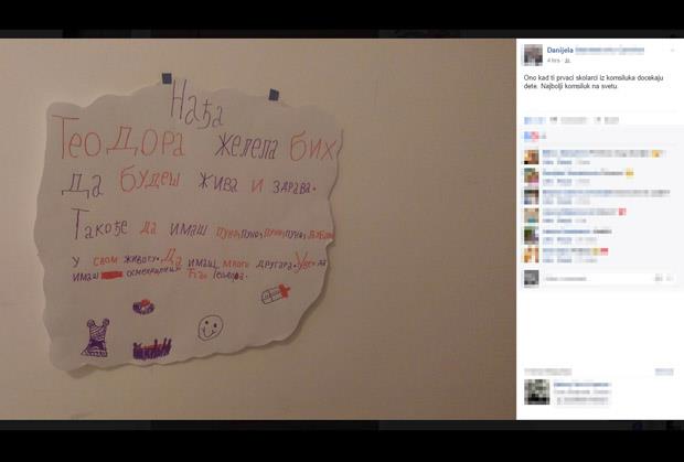 BEOGRAD - Tek rođenoj Beograđanki Teodori komšije iz zgrade poželele su toplu i nesvakidašnju dobrodošlicu čestitkom jednog đaka prvaka, okačenom tik uz vrata novopečenih roditelja.