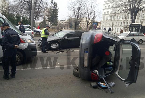 BEOGRAD - U ulici Kneza Miloša, u samom centru Beograda, danas je došlo do direktnog sudara "audija" i "pežoa" posle kojeg se "pežo" prevrnuo na stranu!