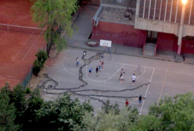 BEOGRAD - Slika sportskog terena u Osnovnoj školi "Jovan Dučić" u novobeogradskom Bloku 21 možda deluje kao iz filmova naučne fantastike, pošto je dvorište pokriveno kanalima koji podsećaju na paukovu mrežu ili krake hobotnice, ali ipak postoji jedno normalnije i racionalnije objašnjenje.