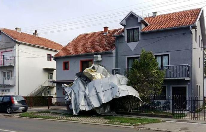 Metalni krov je doleteo sa zgrade preko puta i završio na njihovoj ogradi preko automobila. Udaljenost njihove kuće od zgrade je sigurno više od 50 metara.