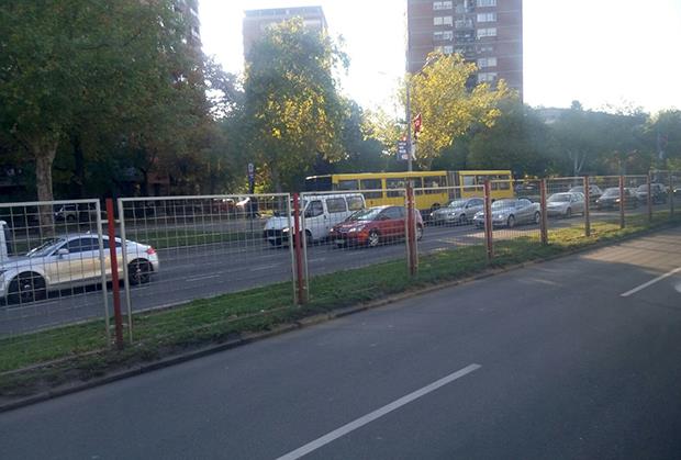 Autobusi sa Brankovog mosta se preusmeravaju desno u Bulevar Nikole Tesle, kruže oko Ušća i čekaju da se uključe u Bulevar Mihajla Pupina.