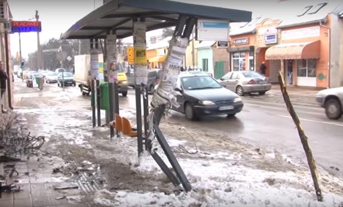 Od jačine udarca stubovi stajališta su iskrivljeni, a sedišta polomljena. Prednji deo automobila je smrskan, a delovi vozila ostali su rasuti po trotoaru.