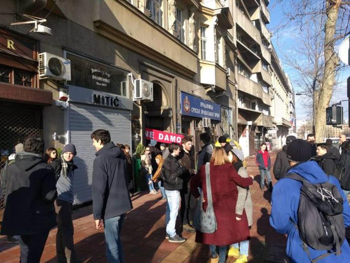 Ispred zgrade parkiran je "patkomobil" Inicijative "Ne da(vi)mo Beograd", ljudi su nosili transparente "Niko bez krova", "Stop" i "Sram, sram, sram", dok je preko ulaza bio zakačen transparent "Ne damo". Hor je na ulazu u zgradu pevao "Aj karmela", "Internacionalu", "Budi se istok i zapad" i pesme posvećene radničkoj klasi.