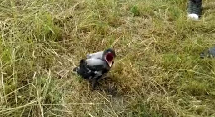 Ptić, koji je ostao bez gnezda, uplašen i sam stajao je na ledini dozivajući majku. Okružen ljudima i decom, koja su se odmah rastrčala da pozovu starije da mu pruže pomoć i vide šta dalje, nemoćno je kreštao na pustoj ledini...