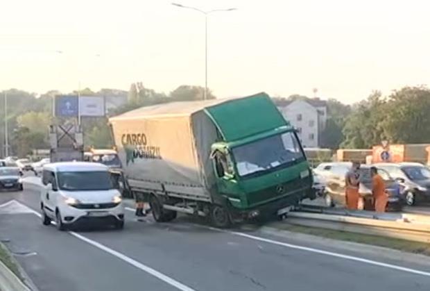 BEOGRAD - Na auto-putu u smeru ka Šidu kod Mostarske petlje oko 7 sati jutros došlo je do neuobičajene saobraćajne nezgode kada je kamion završio nasukan na razdelnoj ogradi.