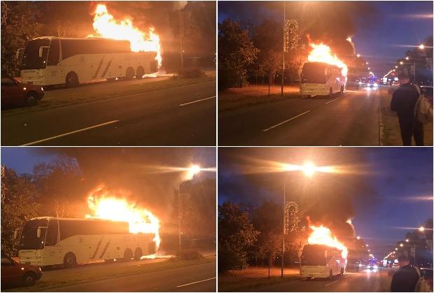 Autobus je u potpunosti u plamenu, a prolaznici su u strahu od eksplozije.