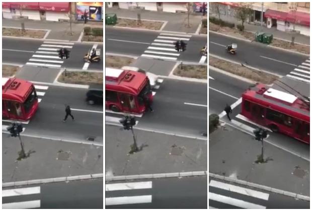 Naime, kako se može videti na videu koji je nastao sa prozora jedne zgrade u Cvijićevoj, muškarac je hodao posred ulice, a onda se zakucao u trolu.