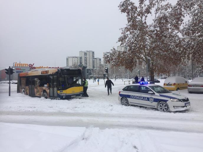 Prema rečima prolaznika autobus se zaglavio dok je skretao na semaforu, a pretpostavlja se da je zaglavio zbog snega.