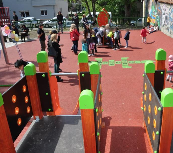 Novoizgrađeno igralište je ograđeno, ima bezbedne rekvizite, podlogu i klupe za odmor.
