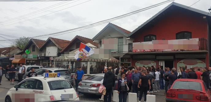 Okupljeni pevaju o Kosovu, skandiraju, a vlasnici pekare su zatvorili objekat odmah po početku protesta.