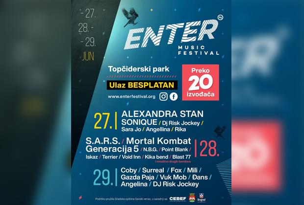 Drugo izdanje beogradskog festivala ENTER, održaće se od 27. do 29. juna u Topčiderskom parku. Tokom tri dana bogatog muzičkog programa, posetioci će imati priliku da uživaju u nastupima najaktuelnijih izvođača, kako svetske, tako i domaće scene. Partner Enter festivala je Centar beogradskih festivala (CEBEF), dok su pokrovitelji i ove godine Gradska opština Savski venac i Grad Beograd.