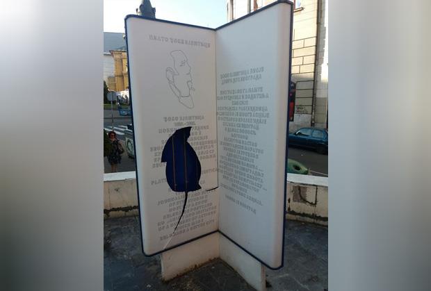 Spomen-ploča poznatom novinaru i jednom od osnivača Studija B Đoki Vještici, koja se nalazi kod Beograđanke, oštećena na delu u kojem je kratka biografija Vještice na srpskom i engleskom jeziku.