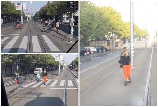 Na njemu se vidi kako devojka vozi električni trotinet i to po tramvajskim šinama.