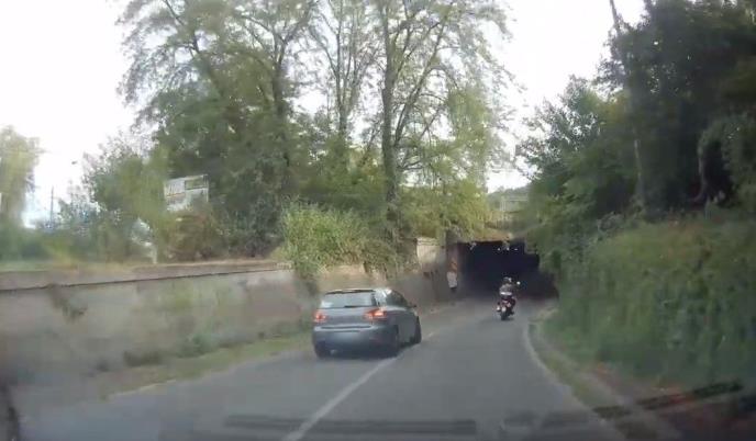 Na snimku je zabeležen trenutak kako vozač na skretanju ispred podvožnjaka pretiče preko pune linije jedno vozilo, a onda je pokušao da pretekne i motociklistu.