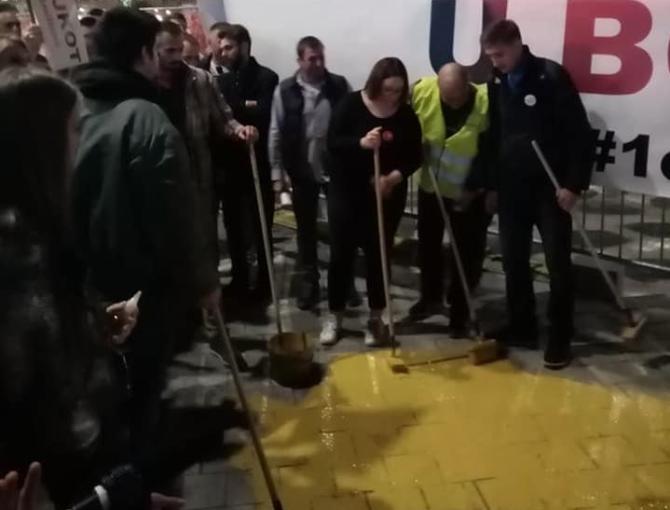 Učesnici večerašnjeg protesta "1 od 5 miliona" su zlatnom farbom prefarbali kocke na delu Trga republike, čime su, kako je rečeno, simbolično pokazli kako izgleda "zlatno doba" o kome vlast priča.