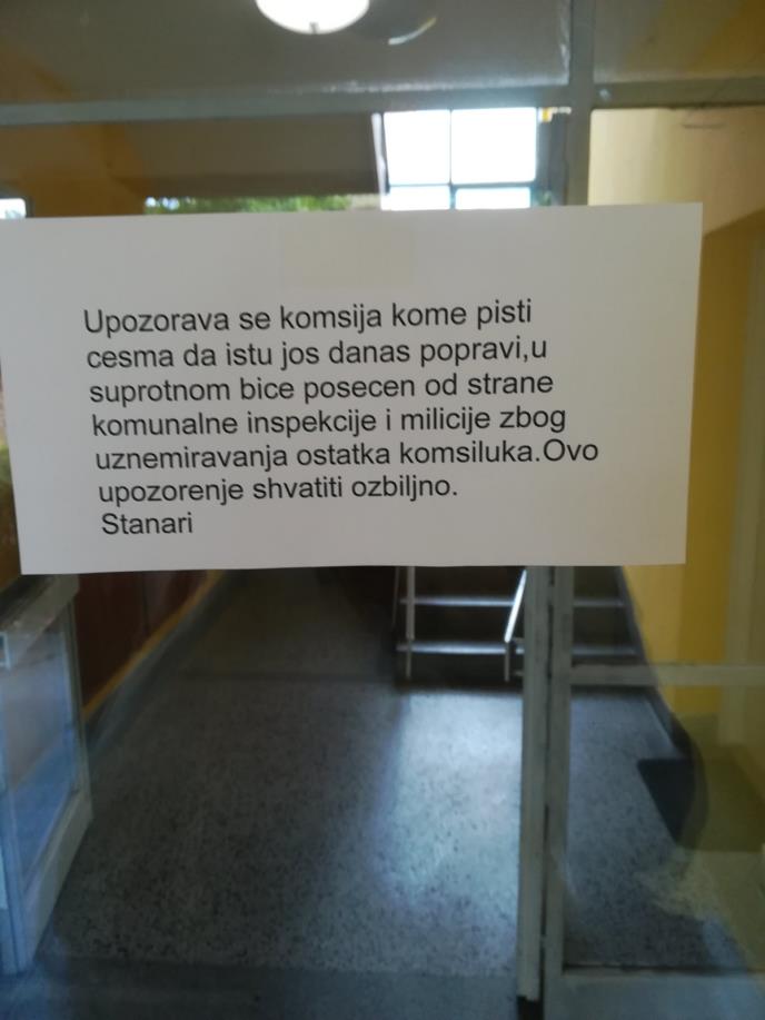 "Upozorava se komšija kome pišti česma da istu još danas popravi, u suprotnom biće posećen od strane komunalne inspekcije i milicije zbog uznemiravanja ostatka komšiluka. Ovo upizorenje shvatiti ozbiljno", piše u poruci koja je zalepljena na ulaznim vratima u zgradu.