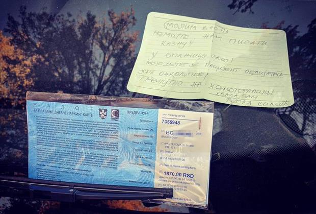 "Molim vas, nemojte nam pisati kaznu. U bolnici smo! Moje dete je pacijent pedijatrijske onkologije. Trenutno na hemoterapiji! Hvala vam. Vesna Simić."