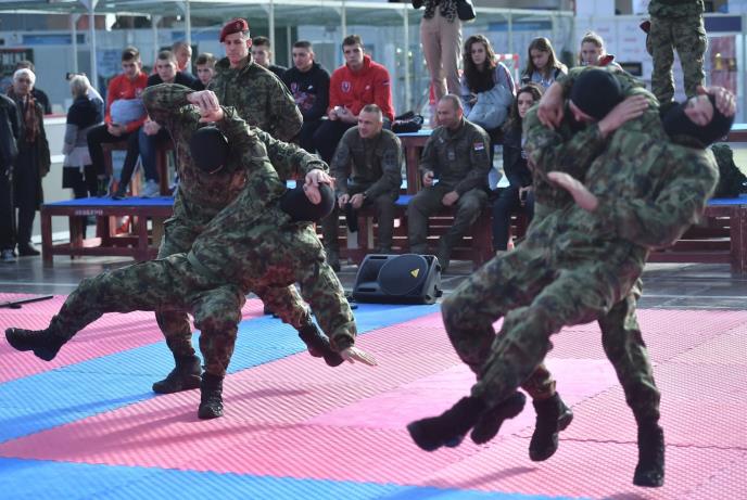 Današnji sajamski dan obeležio je i atraktivan prikaz borilačkih veština pripadnika Bataljona vojne policije specijalne namene „Kobre“ i Specijalne brigade.