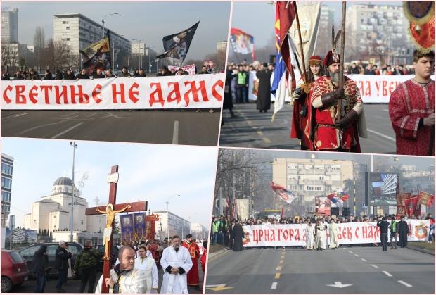 LITIJE U ZEMUNU I NOVOM BEOGRADU: Vernici nosili transparent Svetinje ne damo i Crna Gora mila, uvek s nama bila FOTO Foto: ATA images