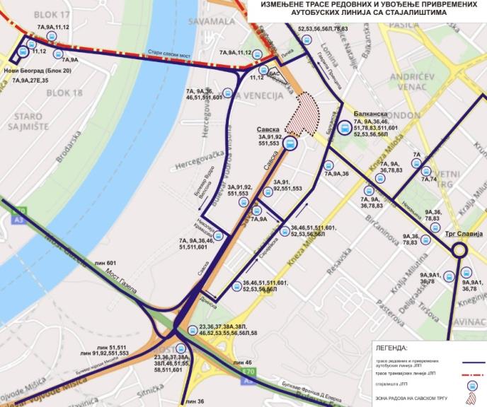 Autobusi 91, 92, 551 i 553 okretaće ispred zgrade Pošte u Savskoj ulici, dok će poslednja stanica autobusima sa linija 511 i 601 biti na početku Balkanske ulice. To je, kako je pojasnio Rafailović, privremeni, prolazni terminus gde se vozila neće zadržavati kako se ne bi stvarala gužva u saobraćaju.