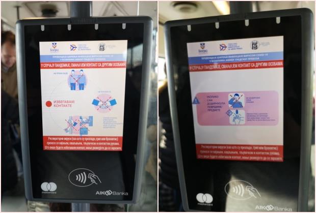 Od jutros se na svim validatorima za očitavanje karata u javnom gradskom prevozu nalaze saveti građanima kako da se zaštite od korona virusa u javnom prevozu, a od ponedeljka će na svim stajalištima i autobusima biti izlepljeni plakati na kojima će biti jasna i precizna uputstva o zaštiti, izjavio je danas zamenik gradonačelnika Beograda Goran Vesić.
