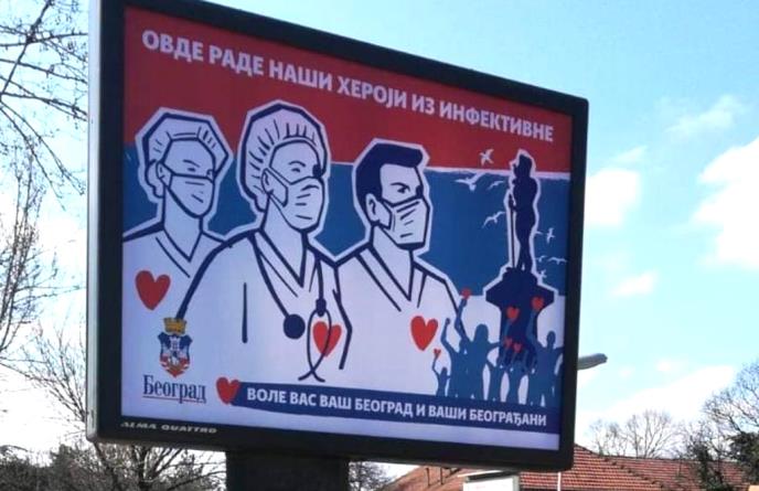 BEOGRAD - Ovde rade naši heroji iz Infektivne! Vole vas vaš Beograd i vaši Beograđani, glasi poruka na bilbordu koji je osvanuo ispred Infektivne klinike u Beogradu, u kojoj se lekari danonoćno bore za živote pacijenata zaraženih korona virusom.