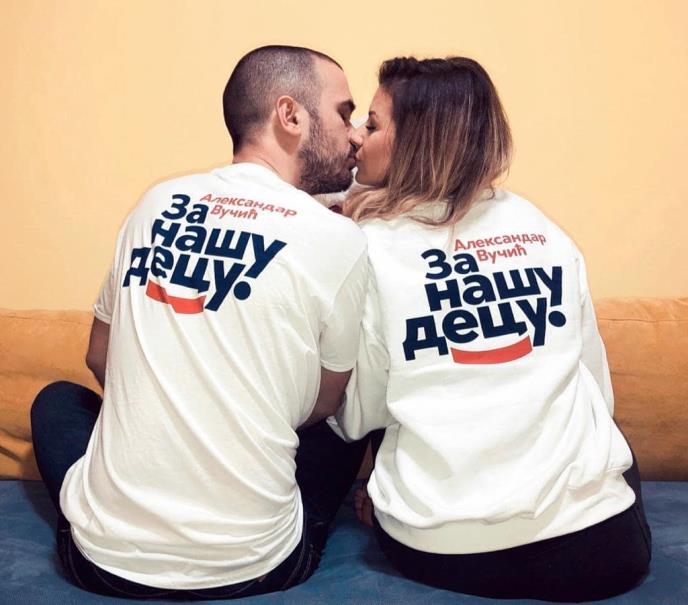 "Za našu budućnost, za budućnost Srbije! Mi podržavamo predsednika Aleksandra Vučića! Mi smo mladi Srbi! Mi glasamo za broj 1! Živela Srbija!", poručuje mladi srećno zaljubljeni par.