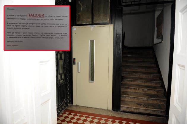 – U zgradi su se pojavili pacovi, pa obratite pažnju da vam ti simpatični glodari ne skoče za vrat, dok čekate lift, na primer. Komšinica Svetlana je prekjuče rano ujutru zanemela kada je iz tog krša na prvom spratu iskočio pacov od pola metra i projurio iz kreveta direktno u podrum. Nama je zgrada u jako lošem stanju, na hodnicima pojedinci drže kojekakve stvari suprotno Zakonu – piše u ovom obaveštenju.