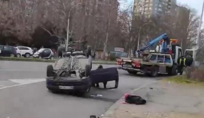 Vozač automobila je udario u službeno policijsko vozilo i od jačine udarca se prevrnuo na krov. Niko nije povređen, a dve osobe su preventivno prevezene u Urgentni centar na pregled.