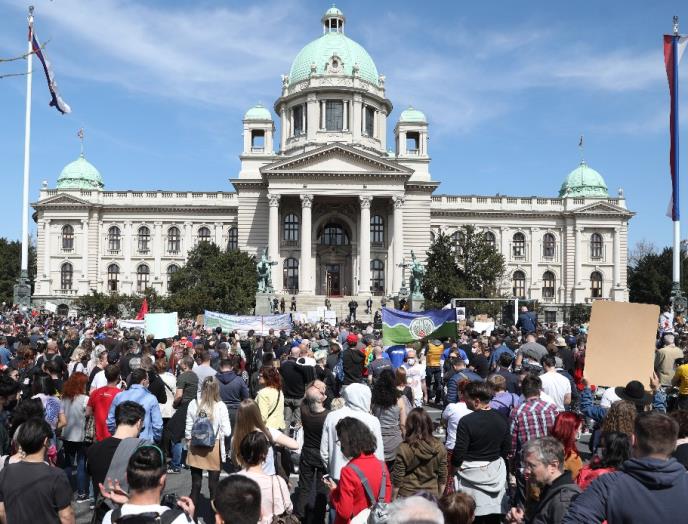 Na platou ispred zgrade parlamenta postavljena je bina sa razglasom. Blokirane su obe trake oko Trga Nikole Pašića a oko polovina okupljenih se ne pridržava protivepidemioloških mera. Organizatori su najavili da učesnici protesta biti u grupama od četvoro ili petoro, a da će razmak izmedju njih biti tri metra. Reč je o protestu za očuvanje reka na kojem će, prema najavama organizatora, biti predstavljeno 20 zahteva.