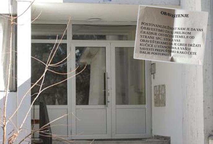 - Poštovani, dužnost nam je da vas obavestimo da su prilikom gradnje osvećeni temelji od strane SPC. Stoga vas obaveštavamo da je greh držati kučiće u stanovima, a vašoj savesti prepuštamo kako ćete dalje postupati - navodi se u obaveštenju.