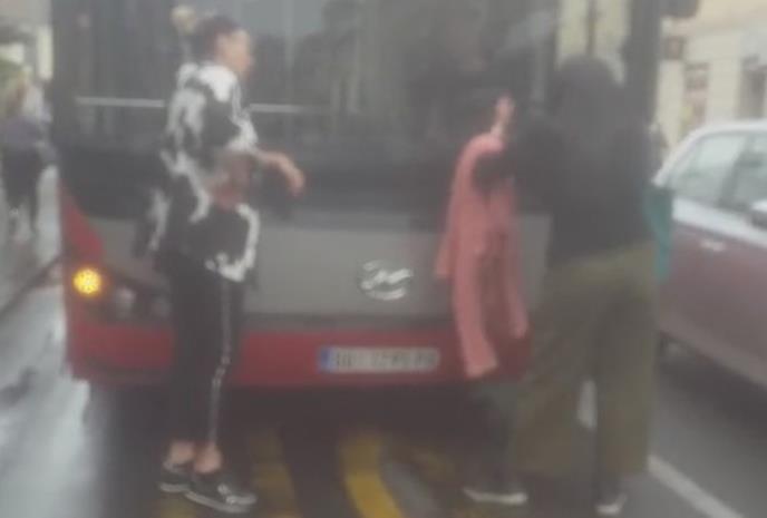 Žena koja stoji pred autobusom javnog prevoza i uz povike udara šakom o šoferšajbnu, očigledno se isprečila na put kako vozilo ne bi nastavilo dalje.