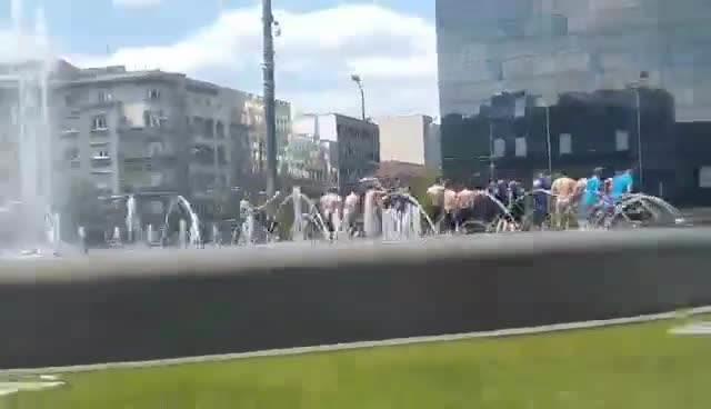Tradicionalno kupanje beogradskih maturanata u fontani na Trgu Nikole Pašića posle poslednjeg zvona koje označava završetak časova u osnovnim i srednjim školama, ovog popodneva zamenilo je rashlađivanje u fontani na Slaviji.