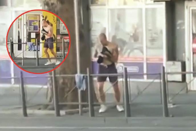 Na društvenim mrežama mrežama pojavio se snimak mladića koji je navukao bokserske rukavice i sparinguje ni manje ni više nego sa saobraćajnim znakom ispred jednog marketa.