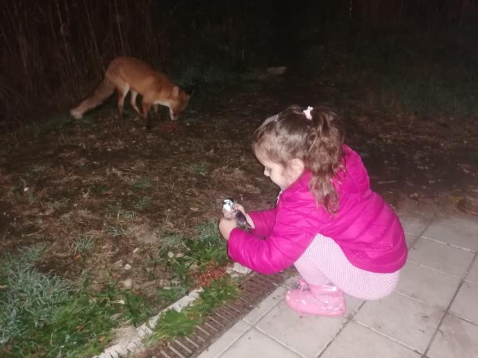 Lisica je večeras posetila naselje Stepa Stepanović i tačno je znala gde treba da i de - pravac pred market. Tu ju je srela malena Ema i lepo nahranila.
